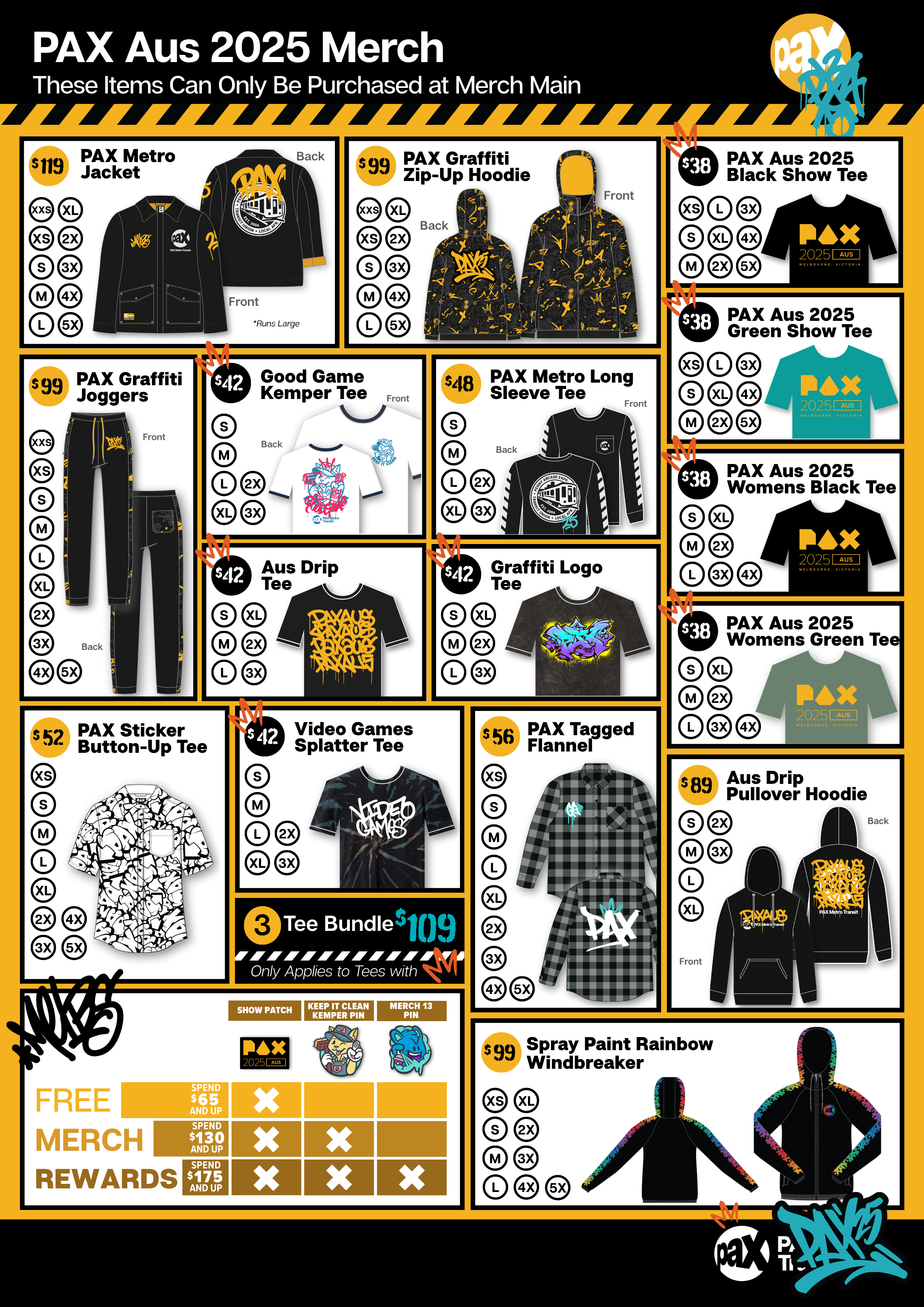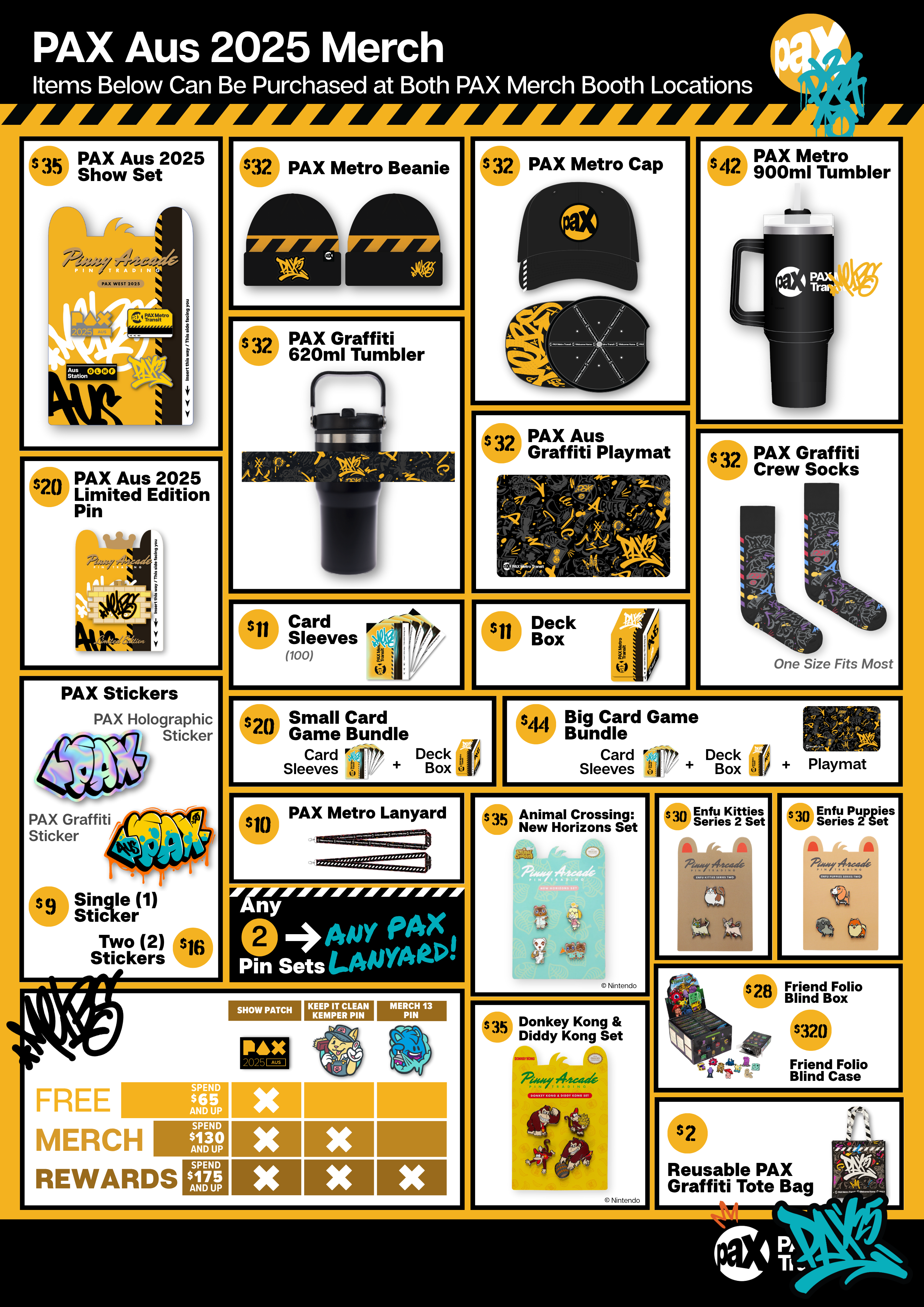 Looking to rep the PAX brand at home and beyond? Dying for some fresh new threads, need your annual PAX logo tee or just looking to complete your Pinny Arcade pin collection? Look no further than the Merch Store! Located right on the edge of the Expo Hall and Tabletop area is our coveted Store of Many Things. Contained within these half-walls are the pins, hoodies, seasonal wear, Penny Arcade tees and PAX Aus-exclusive memorabilia to appease and delight.